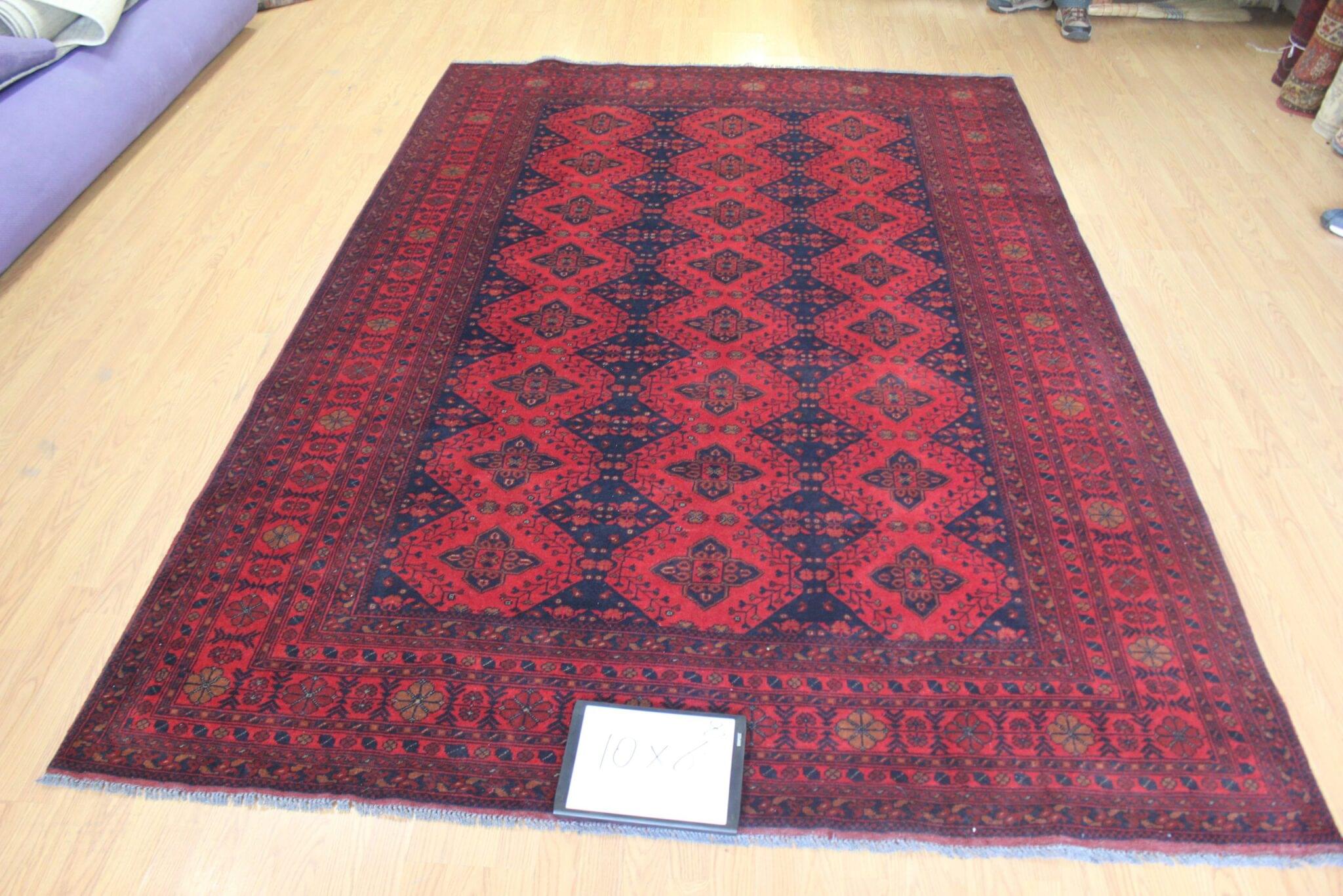 Handwoven Afghan Rug: 4’5″ x 2’7″ ft, Deep Red, Dark Navy/Black, Rust/Golden Brown – Traditional Geometric Motifs for Elegant Interiors