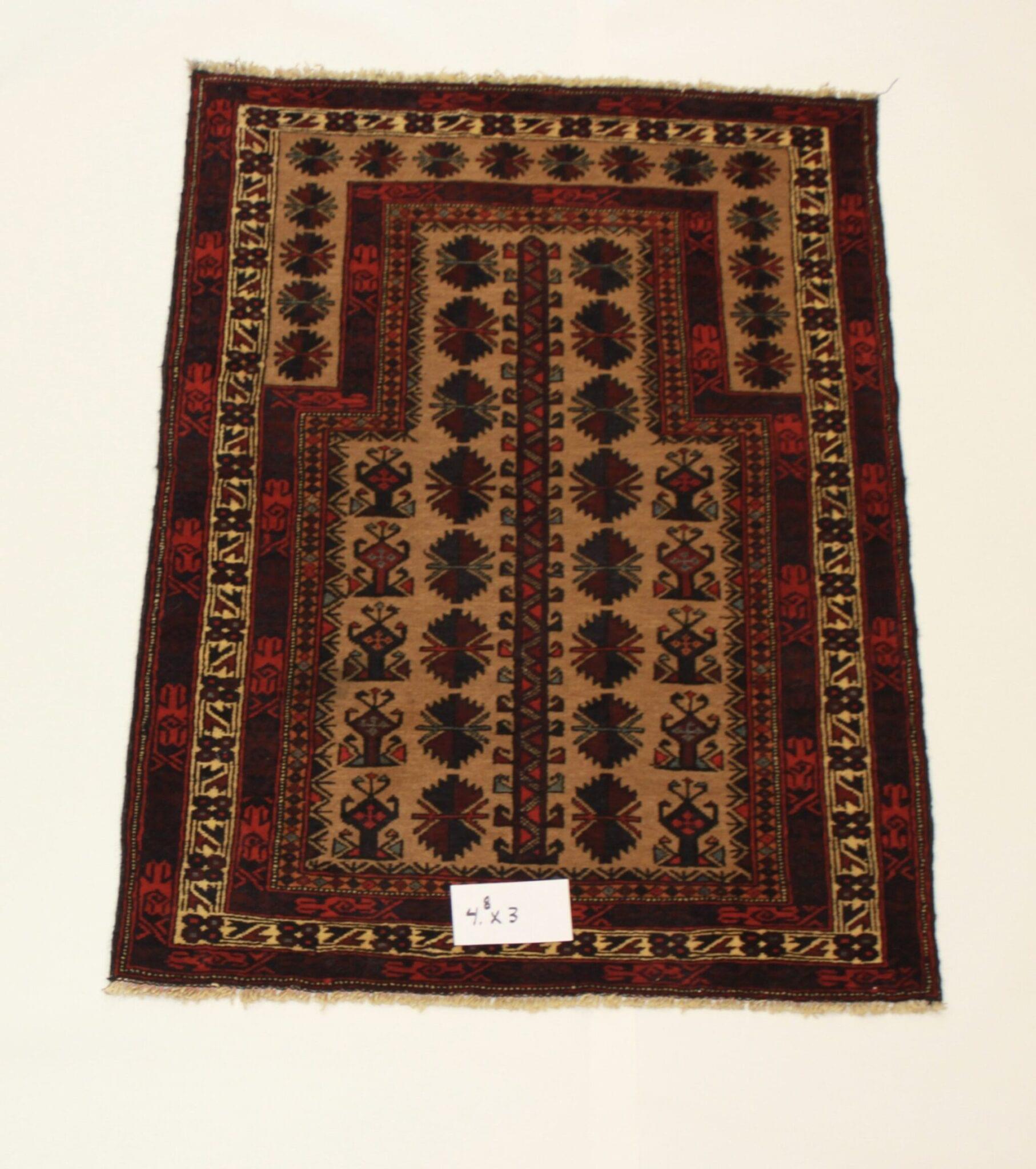 Handmade Wool Baluchi Rug 5×3 ft – Rich Red, Golden Yellow, Dark Brown, Beige/Ivory, Navy Blue