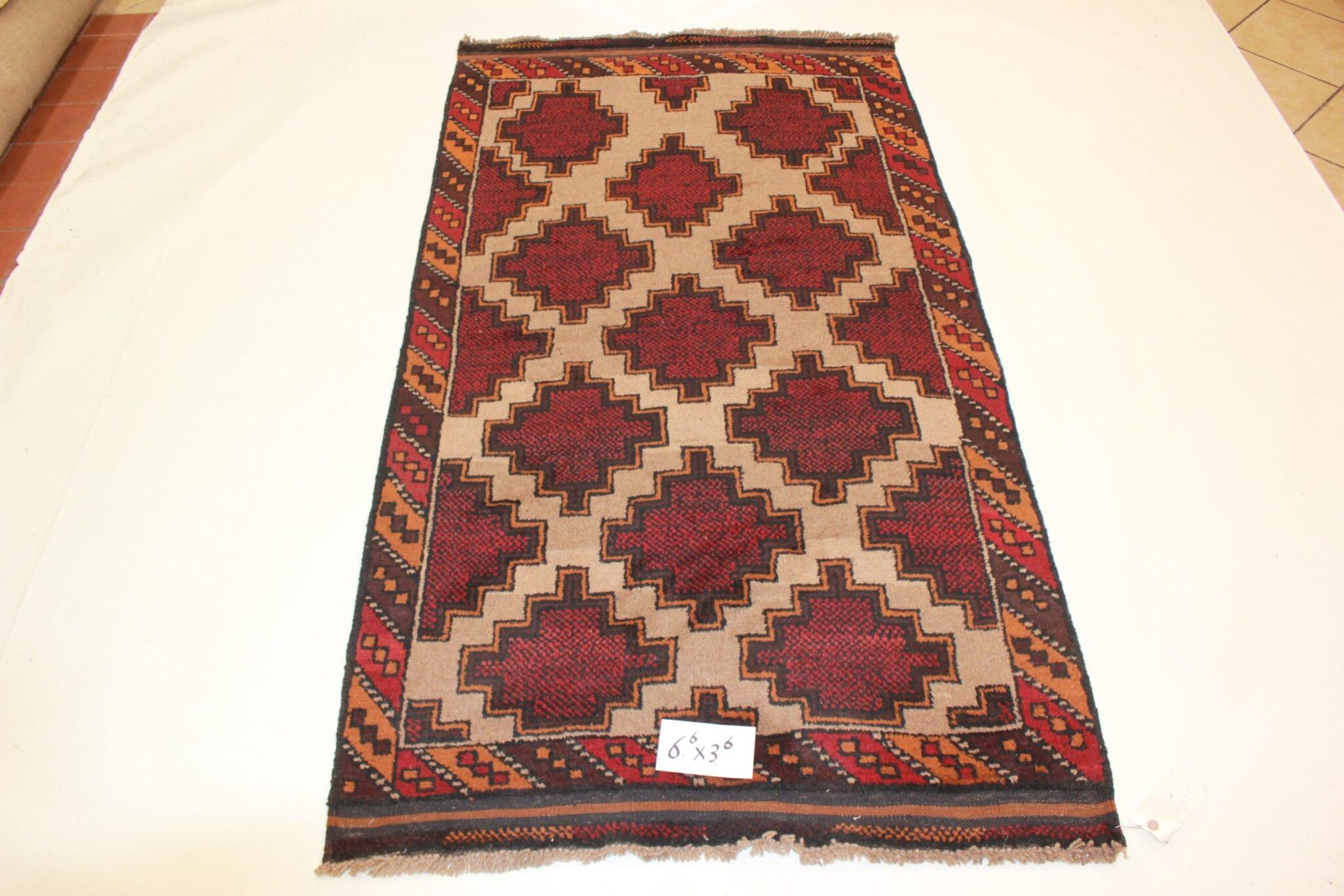 “Handmade Afghan Baluchi Wool Rug – 6’3″ x 3’10” | Bold Tribal Design, 100% Wool, Stain-Resistant
